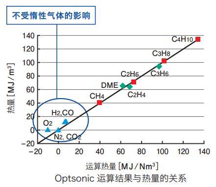 采用本公司獨立開發的Optsonic運算方式,可去除不具有燃料氣體中的熱量的氣體(N2、 O2、 CO2等)的影響,因此能夠進行高精度、高可靠性的燃料氣體的熱量測量。