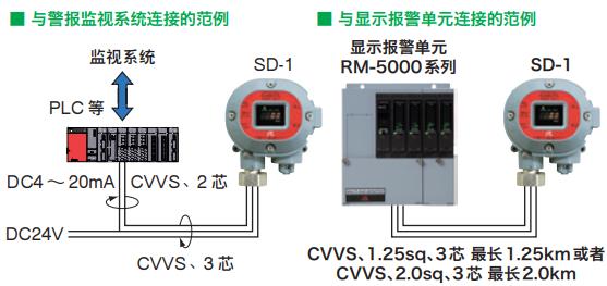 在電源(DC24V)和氣體濃度信號(4-20mA DC)的情況下,連接電纜為3芯。使用接點輸出時為5芯。