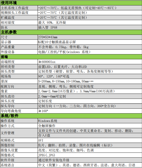 WS-F 系列在線式工業視頻內窺鏡 產品參數: