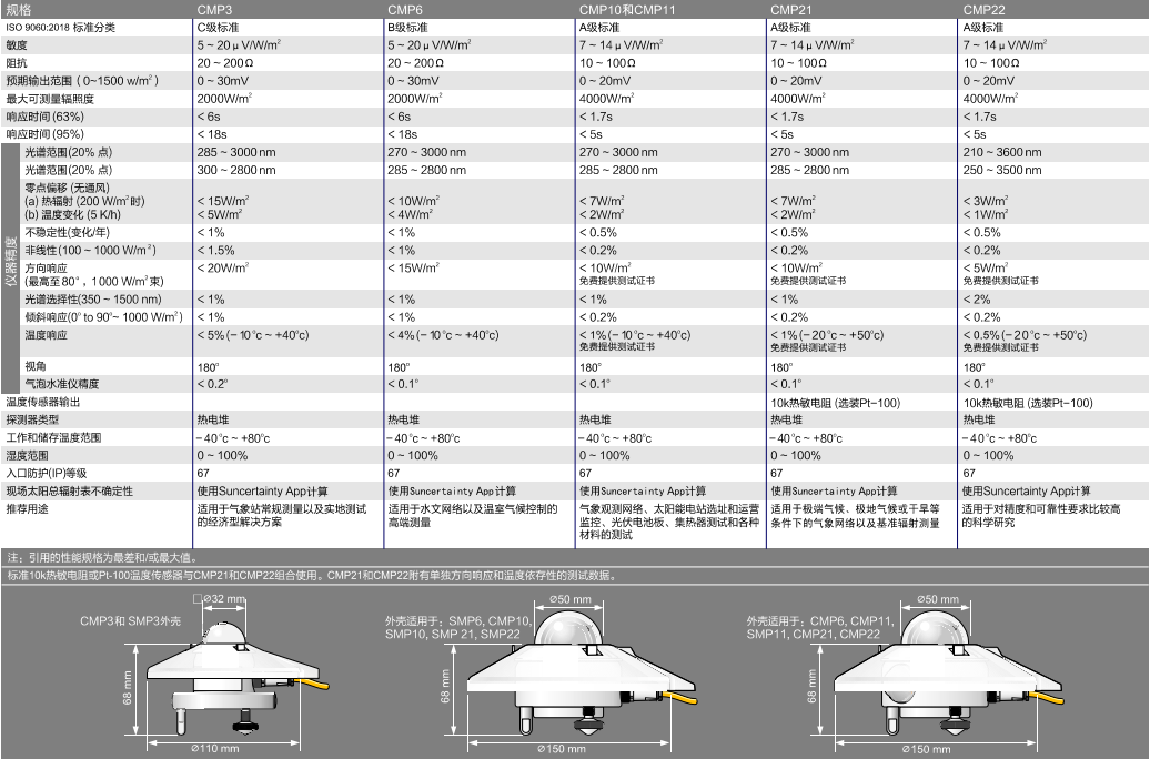 CMP 11采用最初用于CMP 22開發的溫度補償探測器技術,對CMP 6的性能進行了改進。其尤其適合在氣象觀測網絡中使用,響應時間縮短1.66秒(63%),滿足各種太陽能應用需求。