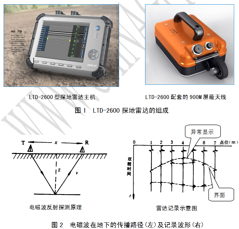 LTD探地雷達由一體化主機、天線及相關配件組成(圖1)。針對探地雷達所用的高頻電磁脈沖而言,通常工程檢測和勘探中所遇到的介質都是以位移電流為主的低損耗介質。在這類介質中,反射系數和波速主要取決于介質的介電常數ε,空氣的相對介電常數為1,最小;水的相對介電常數為81,最大。雷達工作時,向地下介質發(fā)射高頻電磁脈沖(幾十兆赫至上千兆赫),電磁脈沖遇到不同電性介質的分界面時即產生反射或散射,探地雷達接收并記錄這些信號,再通過進一步的信號處理和解釋即可了解地下介質的情況(圖2)。