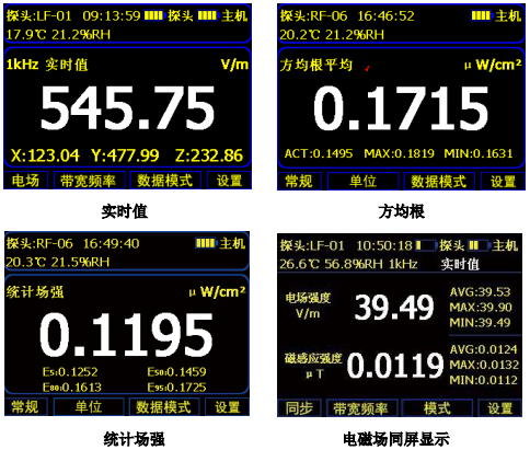 實時值、方均根值、算術平均值、最大值、最小值、統(tǒng)計場強、空間平均、時間曲線、選頻分析等數(shù)據(jù)模式