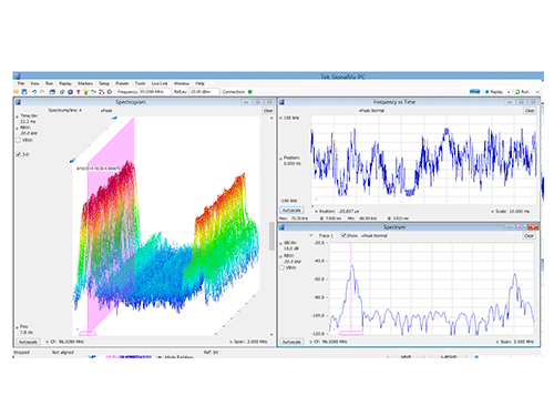 SignalVu-PC 矢量信號分析軟件擁有與 RSA5000 和 RSA6000 系列實時信號分析儀相同的分析功能。 可以對頻率、相位、幅度和調制隨時間變化進行時間相關測量,