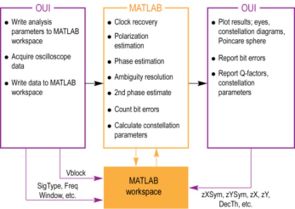 OUI接收有關(guān)用戶提供的信號(hào)的信息以及來自示波器的采集數(shù)據(jù),并將其傳遞到MATLAB工作區(qū),如下圖所示。然后調(diào)用一系列MATLAB腳本來處理數(shù)據(jù)并產(chǎn)生結(jié)果字段變量。然后,OUI檢索這些變量并繪制它們??梢酝ㄟ^連接到OUI或直接連接到MATLAB工作區(qū)來完成自動(dòng)化測試。