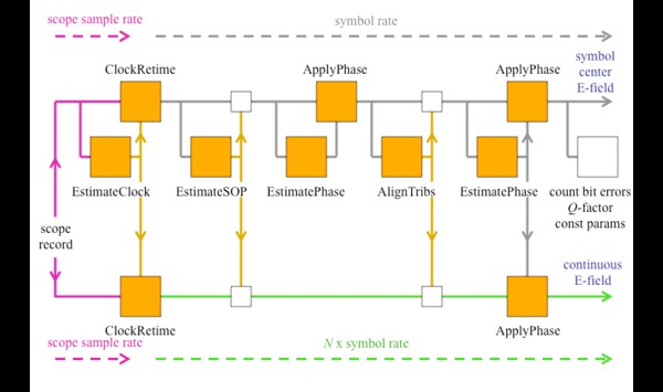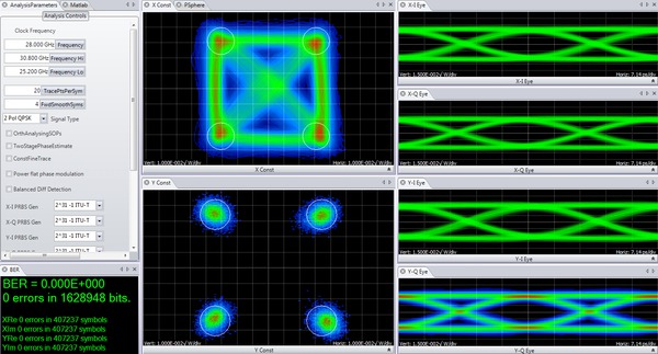 時(shí)鐘恢復(fù)方法取決于所選的信號(hào)類型。然后根據(jù)符號(hào)中心樣本恢復(fù)激光相位。一旦恢復(fù)了激光相位,該場的調(diào)制部分可用于與每個(gè)支路的預(yù)期數(shù)據(jù)對(duì)齊。此時(shí),在考慮了數(shù)據(jù)極性中所有可能的歧義之后,可以通過查找實(shí)際數(shù)據(jù)與預(yù)期數(shù)據(jù)之間的差異來計(jì)算誤碼。該軟件選擇具有最低BER的極性。一旦知道了實(shí)際數(shù)據(jù),就可以進(jìn)行第二次相位估計(jì),以消除可能由于激光相位跳變而引起的誤差。一旦計(jì)算了字段變量,OUI就可以使用它們進(jìn)行檢索和顯示。