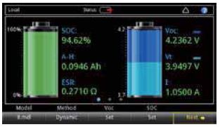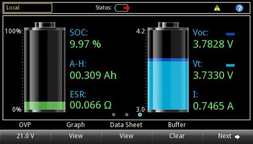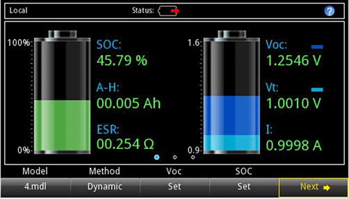 在2281S 的電池仿真器功能中,可以根據選擇的電池模型仿真實際電池輸出性能。 充電狀態(SOC) 和開路電壓(Voc) 可以設置成任何狀態,在特定條件下測試設備。