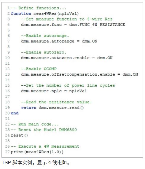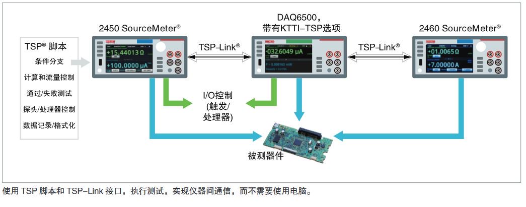 TSP? 腳本可以在儀器上直接運行強大的測試腳本,而不需使用外部電腦控制器。這些測試腳本是完整的測試程序,基于簡便易用而又高效緊湊的腳本語言 LUA (www.lua.org)。腳本是由儀器控制命令和 / 或程序語句組成的一個集合。程序語句控制腳本執(zhí)行,提供了變量、函數(shù)、分支和循環(huán)控制等工具。您可以創(chuàng)建強大的測量應用,而不需集成開發(fā)環(huán)境 (IDE)。測試腳本可以包含傳統(tǒng)編程語言執(zhí)行的任何程序序列(包括決策算法),因此儀器可以管理測試的方方面面,而不需要與電腦通信來制訂決策。這消除了由于 GPIB、以太網(wǎng)或 USB 業(yè)務擁堵而導致的延遲,大大改善了測試時間。