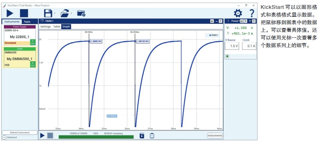 KickStart 可以配置、測試及從多臺儀器采集數(shù)據(jù),包括 DMM、電源、SMU 儀器和數(shù)據(jù)記錄器。您可以同時控制最多 8 臺儀器,從每臺儀器中檢索數(shù)百萬個讀數(shù)。這使得 KickStart 成為一個優(yōu)異的解決方案,可以滿足數(shù)據(jù)記錄需求,使用模數(shù)轉換 DMM 從瞬態(tài)事件中捕獲大量數(shù)據(jù)。