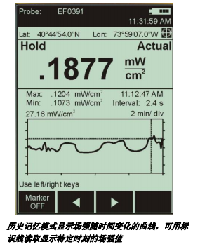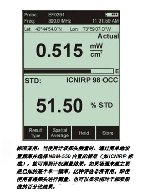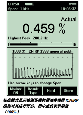 – 內置公眾安全標準限值,在確知頻率的情況下,測量結果可以直接顯示為“百分比標準”(見圖)