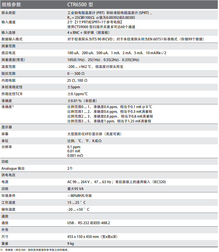 CTR6500帶有25 Ω及100 Ω內部標準電阻,也可使用外部標準電阻。其阻值比值范圍為0 至4.9999999或0至500 Ω,且測溫量程滿足ITS 90、CVD及EN 60751標準。