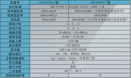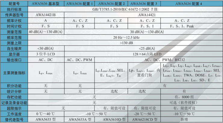 AWA5636型是2級聲級計,適用于一般噪聲測量。由于AWA5636型的配置不同,主要技術性能也有差異,詳情見下表: