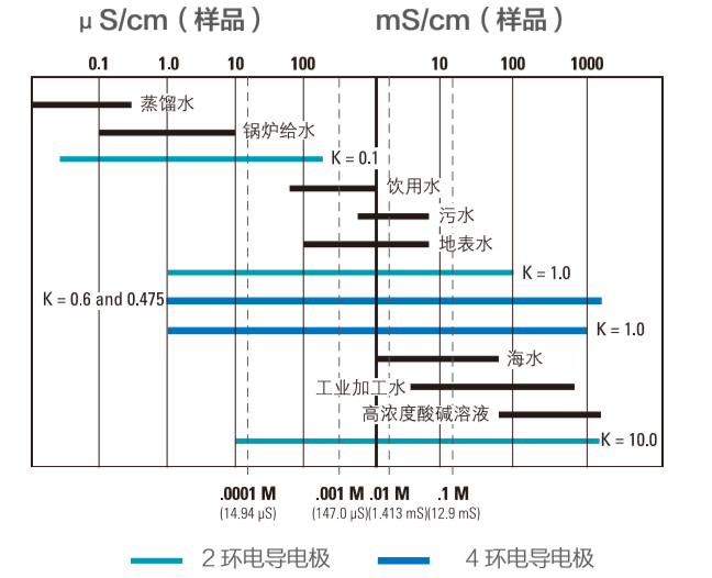 類水質電導率范圍示意圖及電極常數(K)選配表