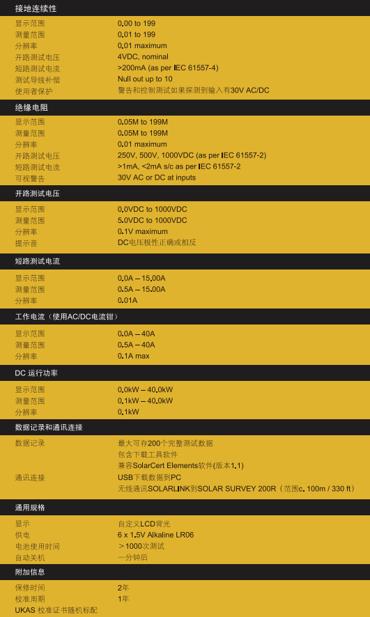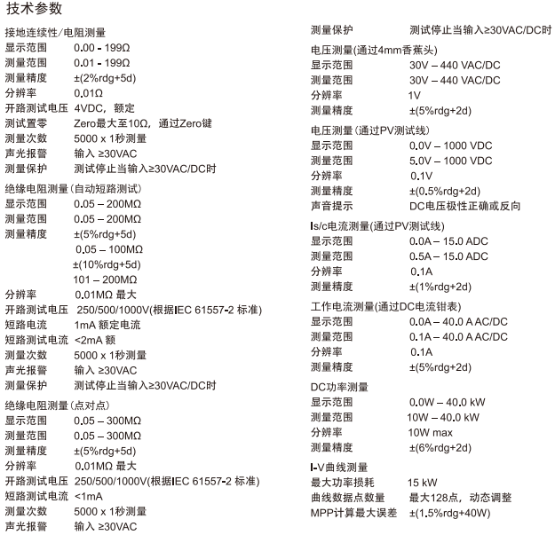德國GMC-I高美測儀電站安規(guī)及IV曲線測試儀SEAWARD PV200 產(chǎn)品參數(shù):