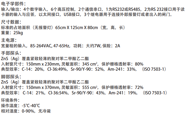 對α、β測量采用Ar/CH4,Ar/CO2流氣式計數管。對γ監測采用密封的氙計數管。尺寸小巧,運輸方便,可以方便地通過任何標準的門,帶有大面積計數管,并有內置的不銹鋼支架做保護。