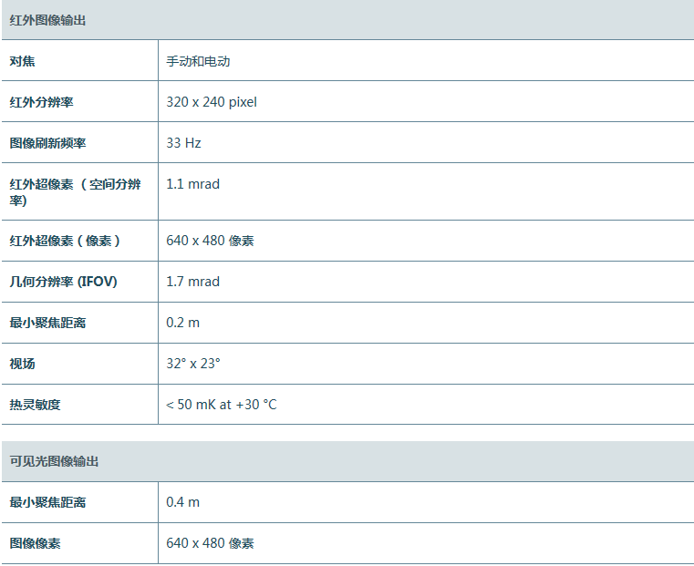 紅外分辨率 320 × 240 像素;采用SuperResolution紅外超像素技術后,可提升至 640 × 480像素;熱靈敏度< 30 mK