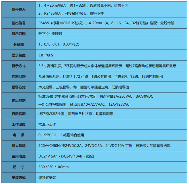 我公司設(shè)計的主機報警控制器H-110模塊化結(jié)構(gòu)設(shè)計,標(biāo)準(zhǔn)通道為1路(最多32路)4-20mA輸入信號,同時可接255路RS485輸入信號,更多通道輸入信號可訂做,控制器與控制器之間可以互相通訊。并且4-20mA與RS485可同時輸入;數(shù)據(jù)輸出支持標(biāo)準(zhǔn)MODBUS協(xié)議,同時可選配:8路4-20mA輸出、以太網(wǎng)模塊、支持云端的上位機電腦監(jiān)控軟件。
