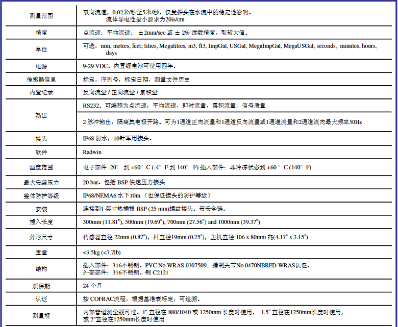 5.?面積速度傳感器精度:流速大于0.5m/s精度為± 2 %, 流速小于0.5m/s,精度為0.01 m/s,;