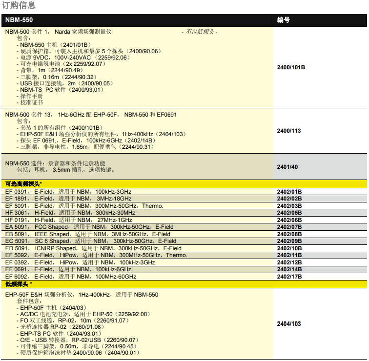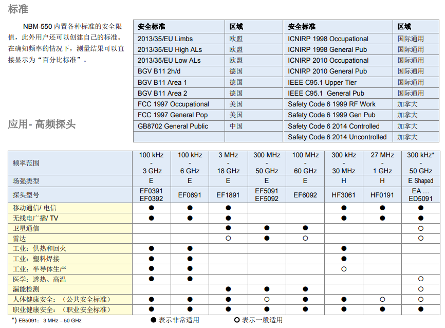 寬頻電磁輻射分析儀 NBM-500 系列,能極其準確地測量非電離輻射。探頭覆蓋了從長波到微波輻射的所有頻率,通 過配備不同類型的探頭可以測量電場、磁場強度,同時配備有 普通探頭和其他基于人體安全標準的計權類型探頭,這些探頭 均通過獨立校準,并且使用非揮發性存儲器存儲探頭參數和校 準參數。因此,探頭可以用于任何一款 NBM-500 系列儀器上 而不會對準確度有任何損失。