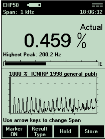 標準模式顯示被測場強的頻譜并根據 ICNIRP準則對其進行評估,圖中虛線表示限值(100%)