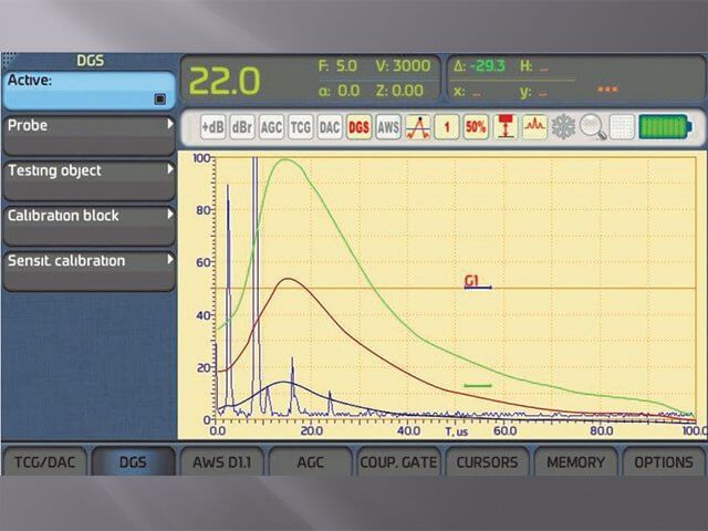 對于給定的等效直徑(面積),DGS系統允許為直射束和角射束單元件傳感器建立多達3條DGS曲線。 它還可以直接讀取De 和/或 Se的讀數,以進行門控指示。
