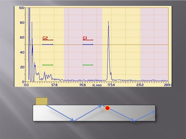 “腿部標記”模式更改為A-掃描背景標記A-掃描與黃色的下垂腳和粉紅色的下垂腳對應的零件。 這有助于從視覺上估計引起指示的反射器(缺陷)的深度。