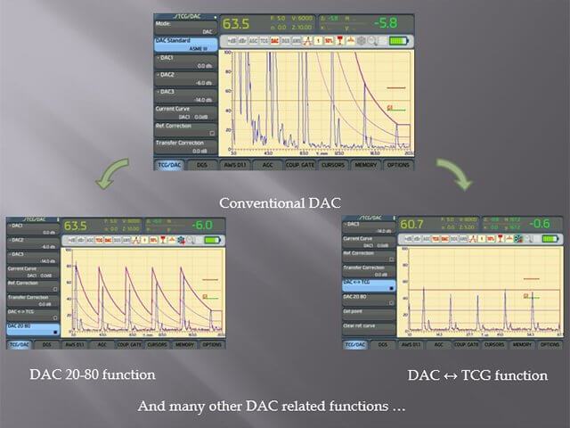 內置的DAC系統可根據以下代碼構建DAC曲線:ASME(單曲線和3條曲線),EN 1712,EN 1713,EN1714,JIS Z3060,GB 11345,GB4730。還可提供用戶預設。 基本曲線最多可以包含128個點。 最多可以建立6條其他曲線。 除了在任何DAC系統中使用的所有標準功能外,Sonocon BL還提供諸如“ 20-80”功能,DAC