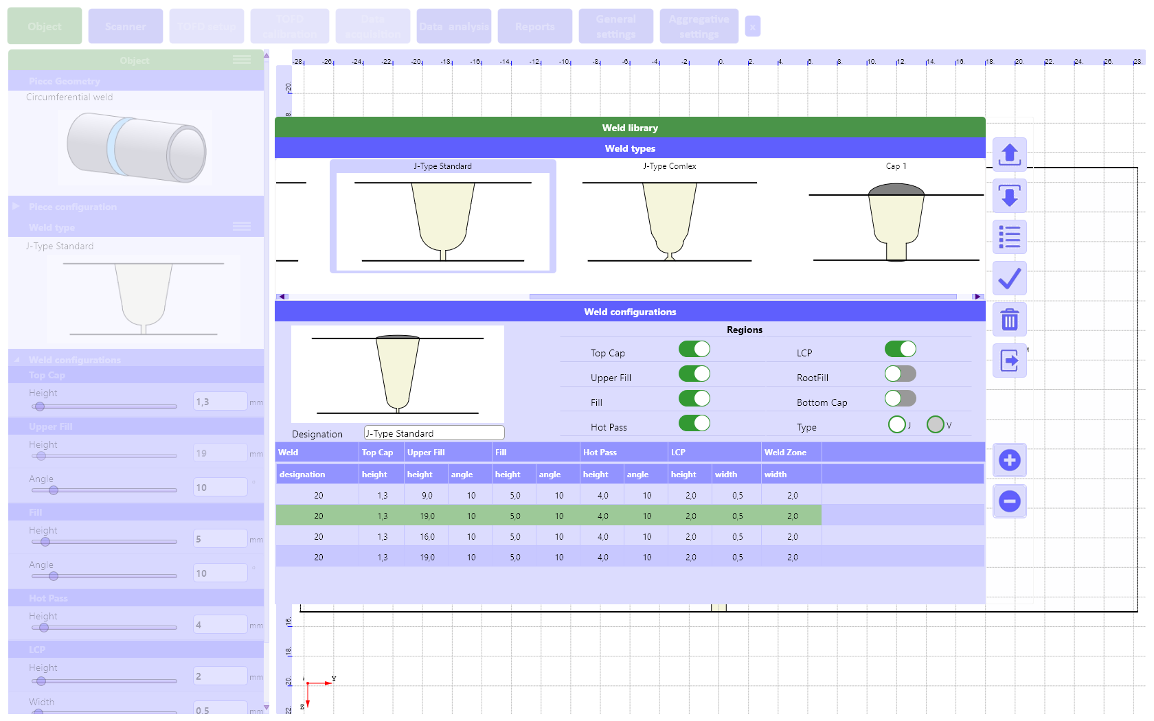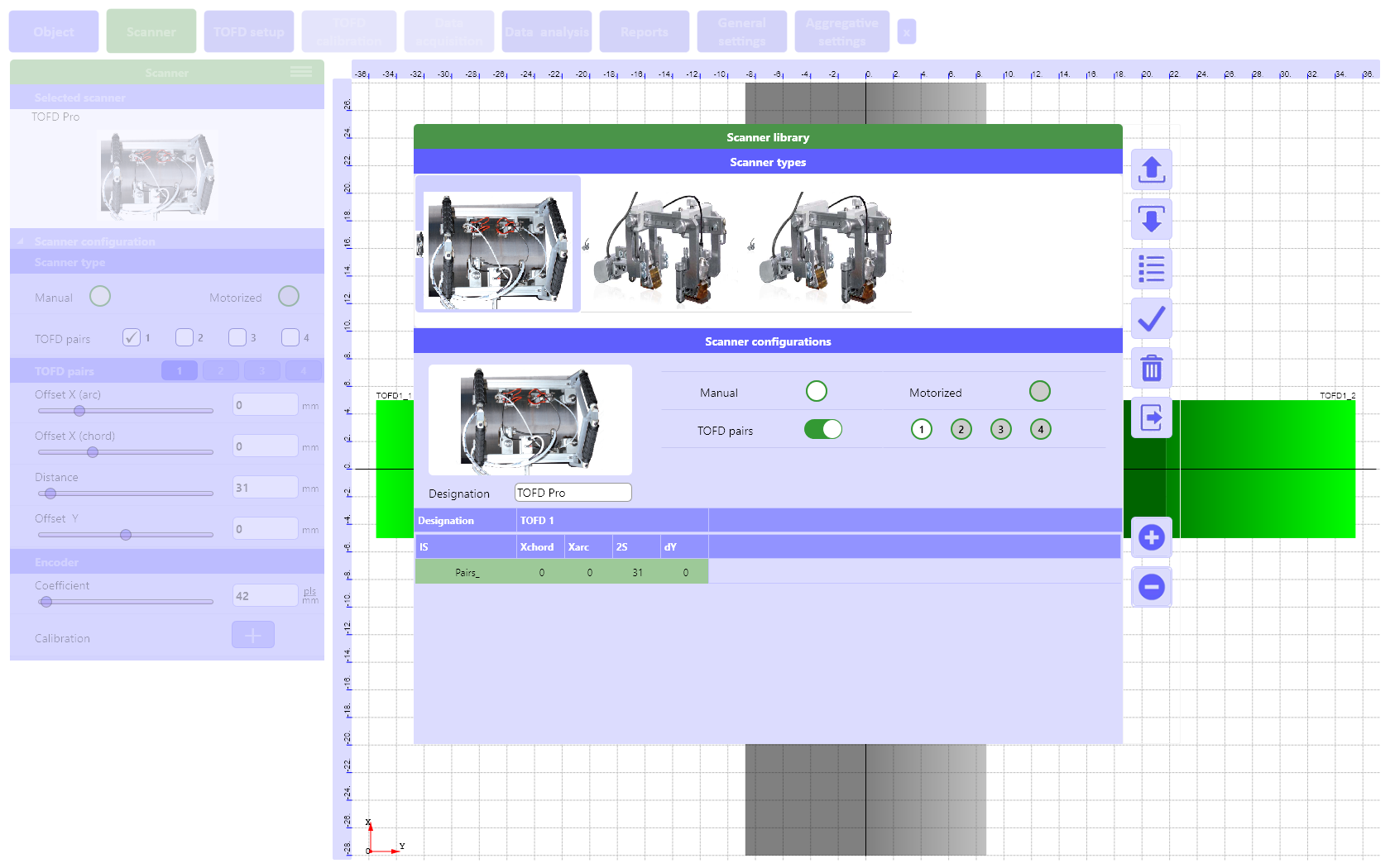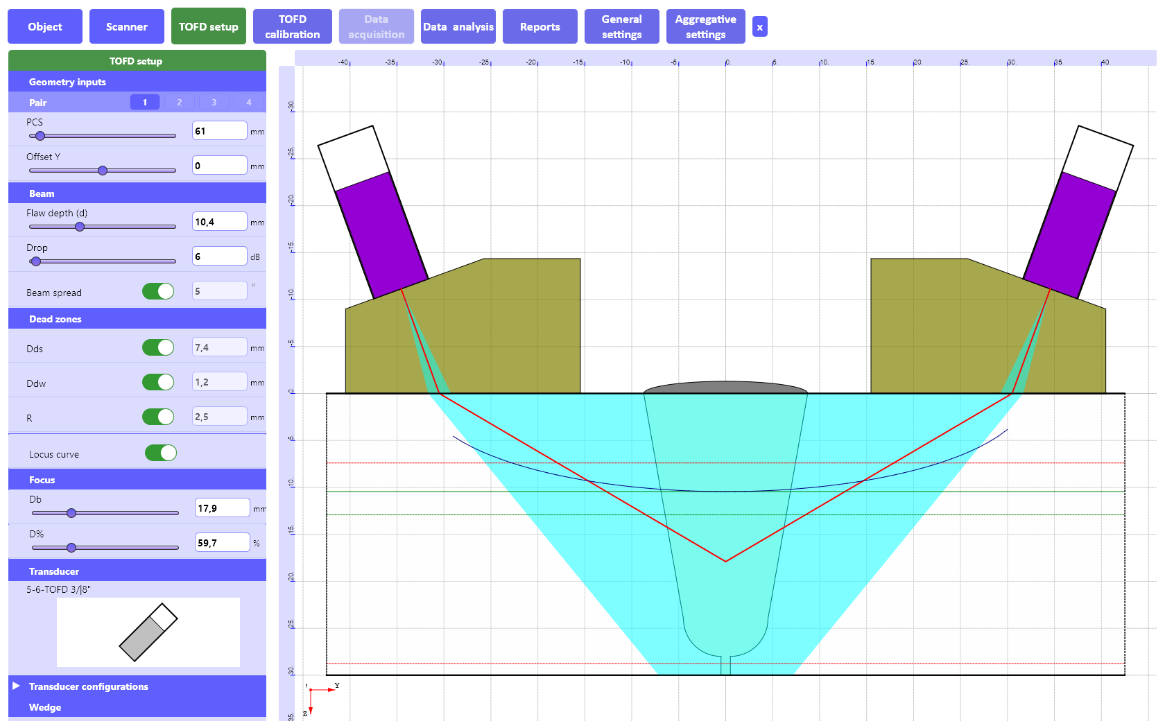 TOFD系統軟件包含多個選項卡,這些選項卡允許無損檢測檢查員執行逐步的設置過程以及數據采集及其分析。 該軟件可以通過鼠標和觸摸屏進行管理。