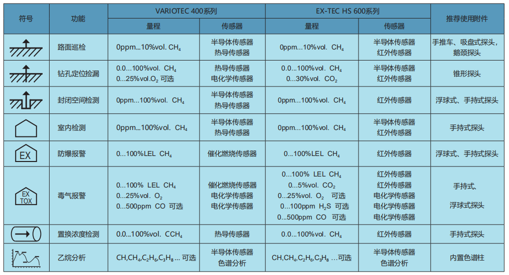 德國豎威公司開發的手持式多功能檢測儀VARIOTEC 400系列,與EX-TEC HS 600相似(區別在下面有詳述),可以進行常規的檢漏、定位漏點、濃度測量、測爆、管道置換濃度測量等功能。該檢測儀還內置色譜分析功能,可以完成乙烷分析(用于區分天然氣和沼氣),也是燃氣管網全面維護的常備工具。